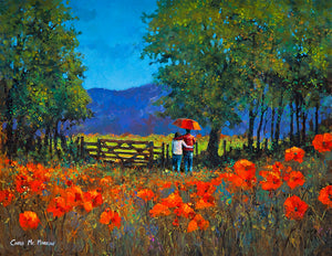 This is a limited edition print of one of my original acrylic paintings. The impressionistic style depicts a couple walking in a stunning field of poppies that seems to sweep towards an old wooden fence. The summer rain shower has cleared leaving a charming and peaceful atmosphere. Beyond the fence a vast, lush green field with more poppies dotting the landscape. In the distance, the bluish mountains and pale blue sky provide a stunning backdrop, enhancing the overall beauty of the painting. The vivid red and orange hues of the poppies are striking and create a wonderful contrast against the calming blue and green tones of the background. The painting is a nod to the simple beauty of nature.